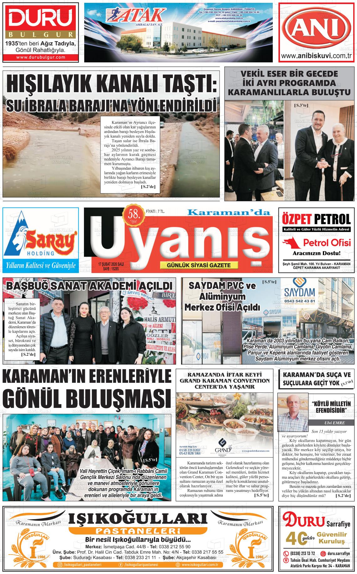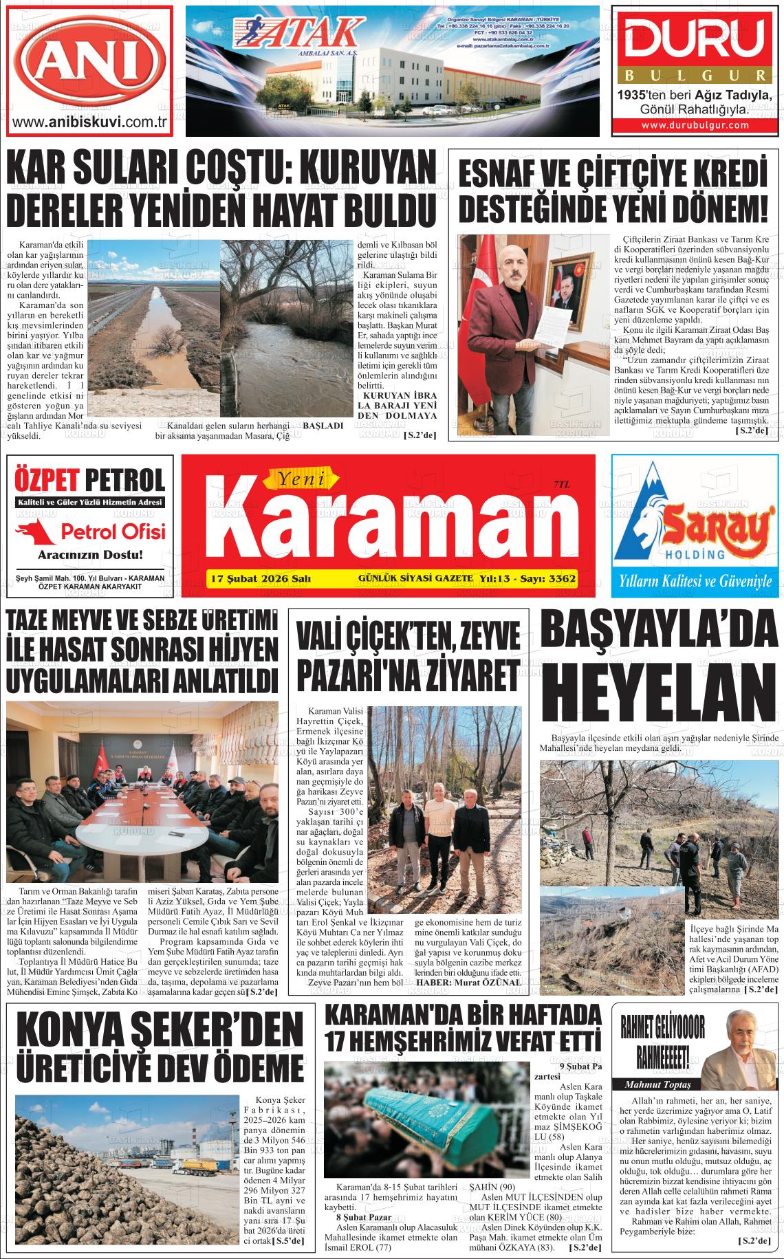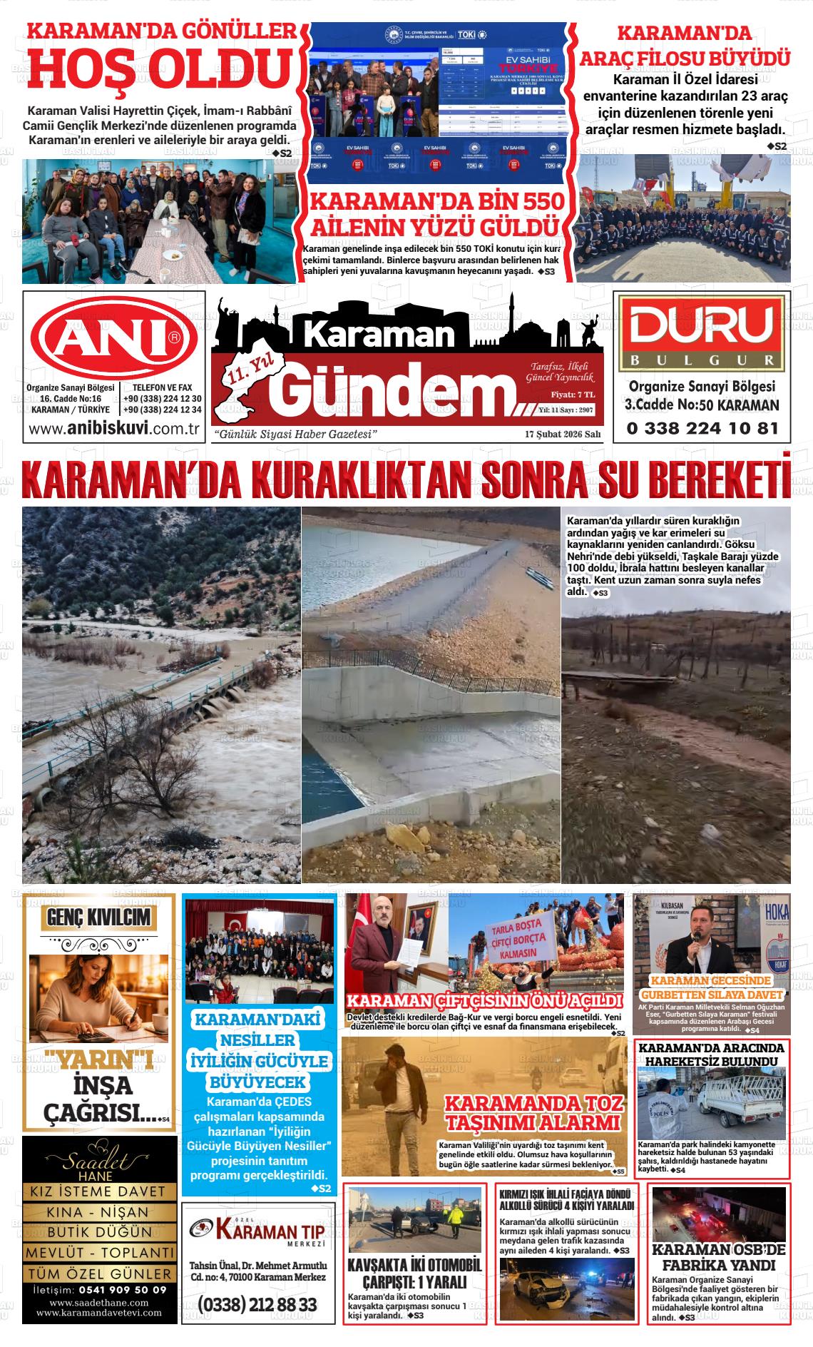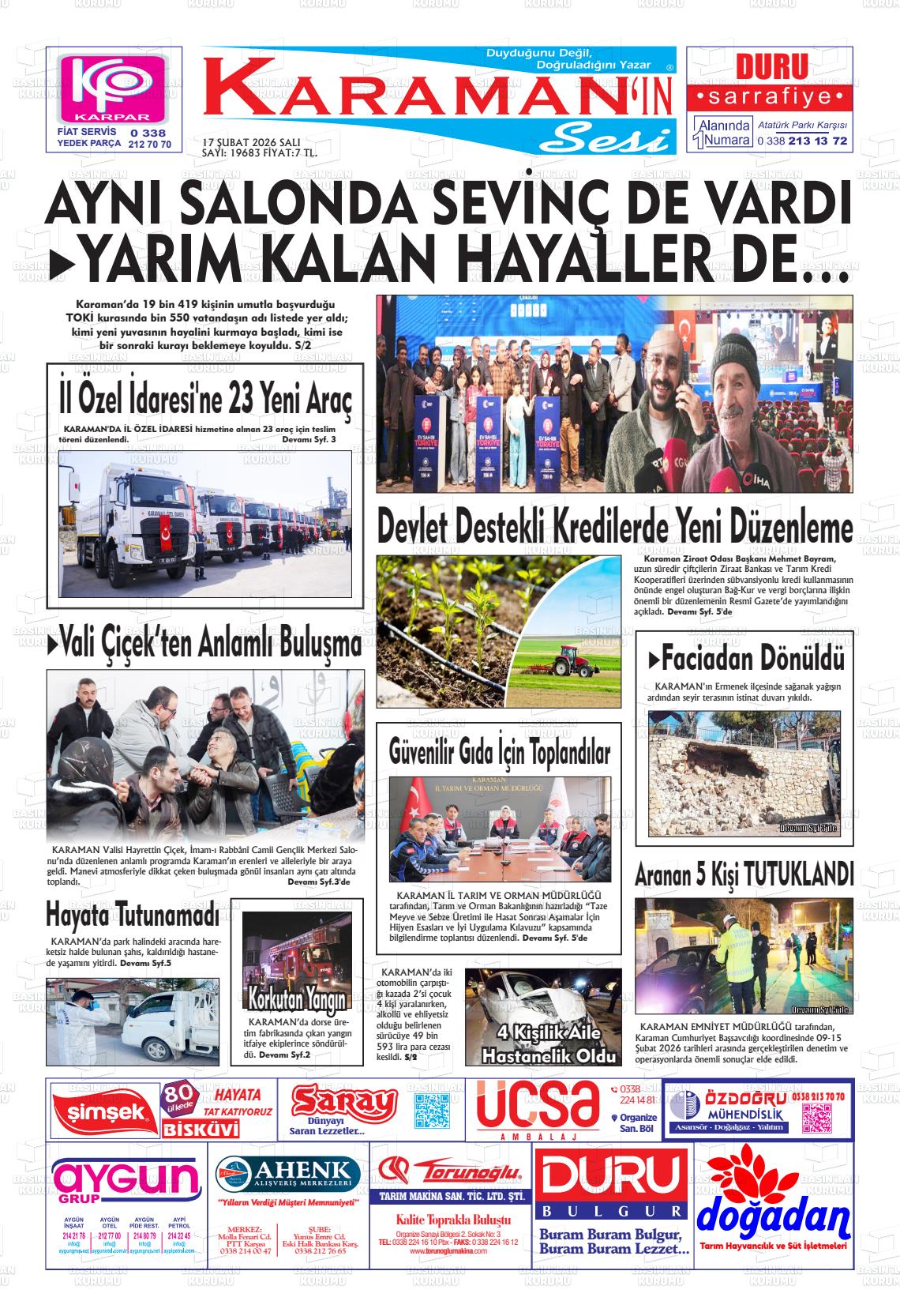 Karaman Yerel Gazeteleri 17 Şubat 2026, Salı Günü Manşeti